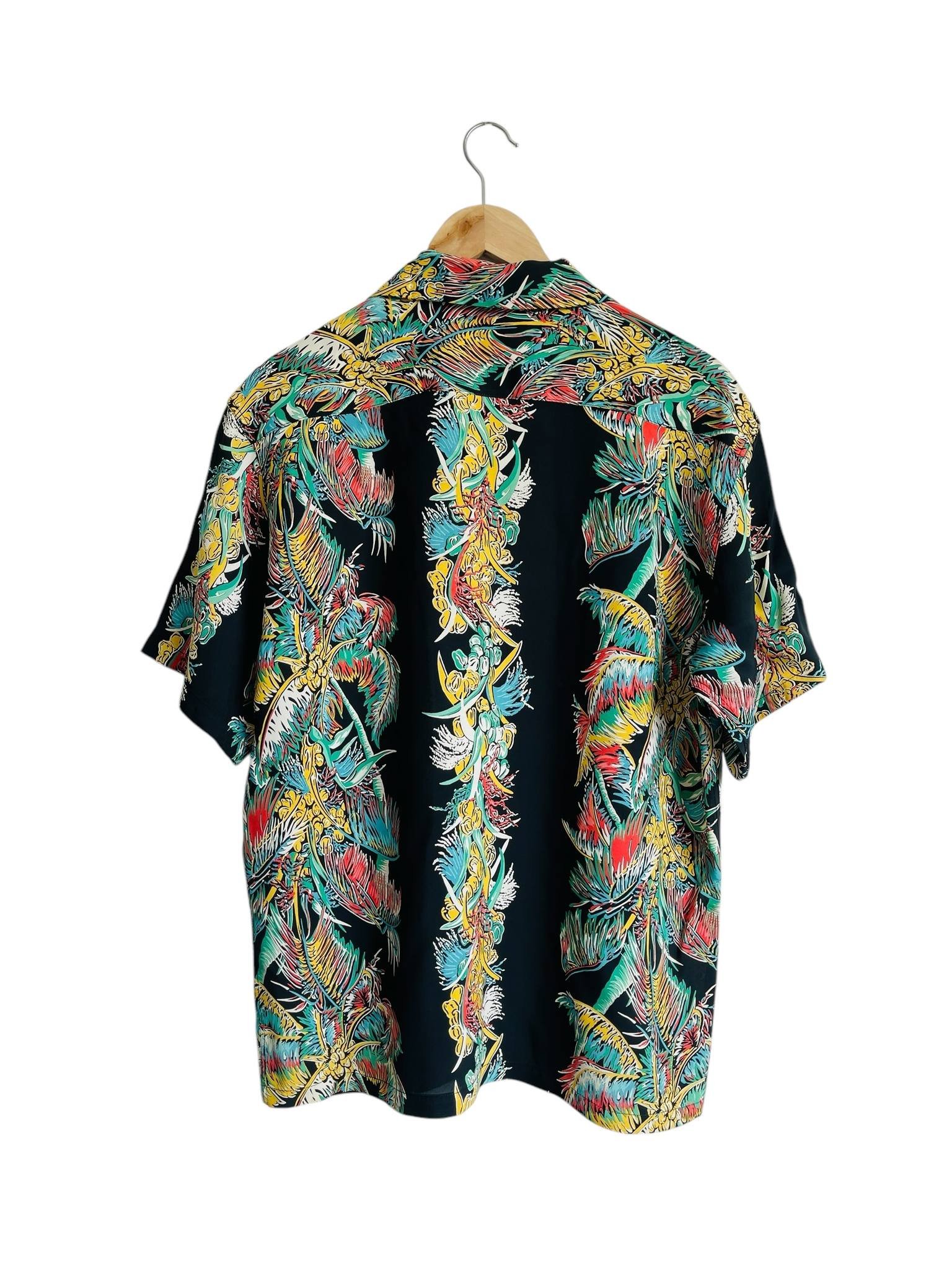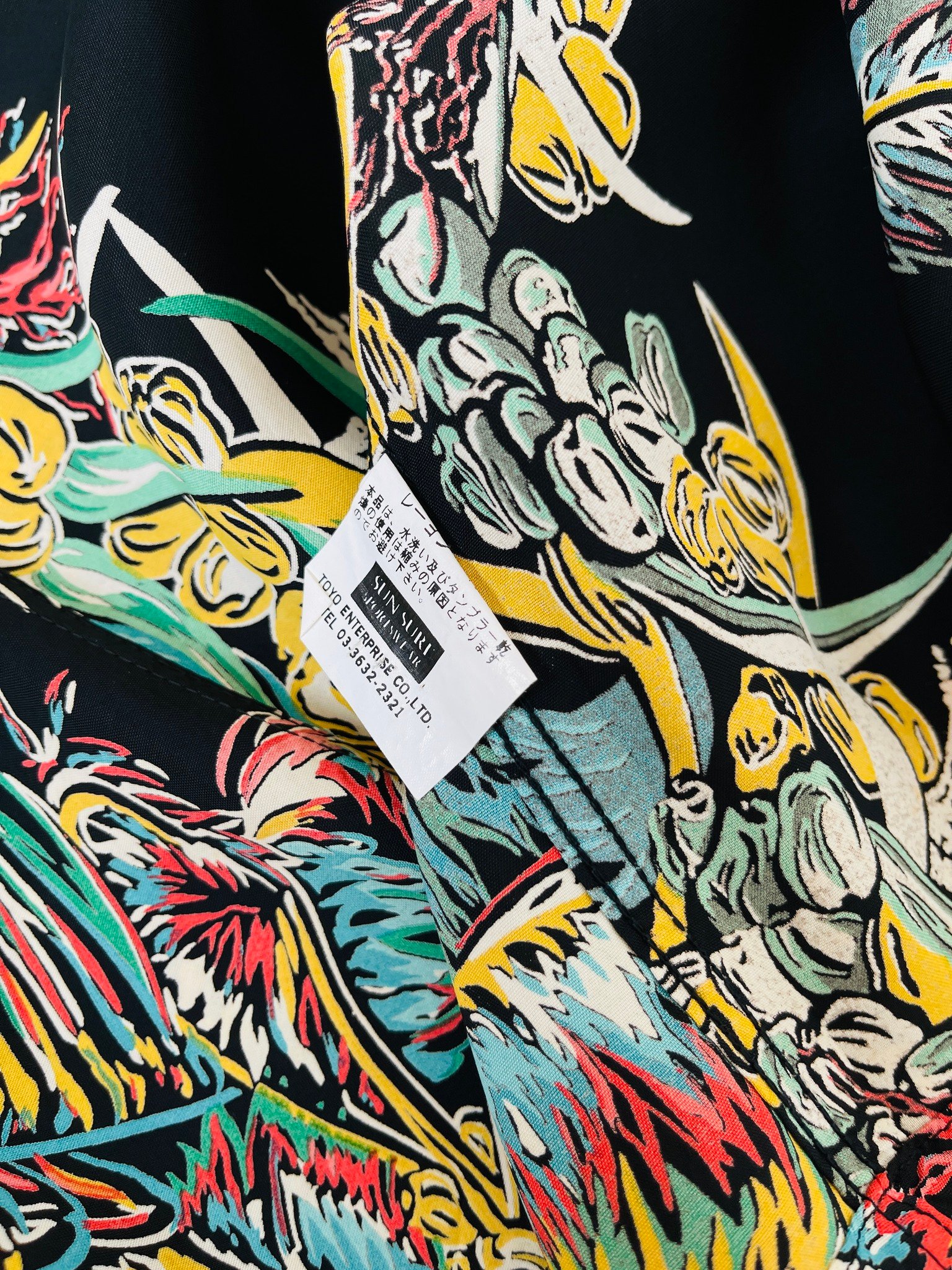 เสื้อฮาวายแบรนด์โด่งดังอย่าง SUN SURF ตัวนี้รหัสขึ้นต้นด้วย M รุ่นเก่าผลิตก่อนปี 2000’s มาในลวดลายของ ต้นปาล์ม ต้นไม้ประจำเขตร้อนในฮาวาย ที่เรา มักจะพบเห็นได้บ่อยมากๆในหมู่เกาะฮาวาย โดยลวดลายของต้นปาล์มนั้นเราจะเห็นหลายๆแบรนด์นำไปพิมพ์ลงบนเสื้อฮาวาย โดยจะมีรูปแบบลักษณะที่แตกต่างกันไปตามเอกลักษณ์ของแบรนด์ ตัวเสื้อสีดำสนิท พิมพ์ลายทั่วทั้งตัวโดยใช้เทคนิคการพิมพ์ซ้ำ วางลวดลายได้อย่างสวยงามลงตัว โดยใช้สีชมพู เขียว และสีเหลือง วางแบบ BOEDER แนวตั้ง เนื้อผ้าจะเป็นเรยอนแท้ สภาพโดยรวมใหม่มากๆสำหรับตัวนี้ครับ ใครที่ชื่นชอบลวดลายคลาสสิค เรียบๆใส่ง่าย แนะนำเลยครับ ของจริงสวยงาม ป้ายแคร์ชัด สภาพดีมากๆ ของจริงสวยเลยครับสำหรับตัวนี้ไม่ค่อยพบเจอได้บ่อย